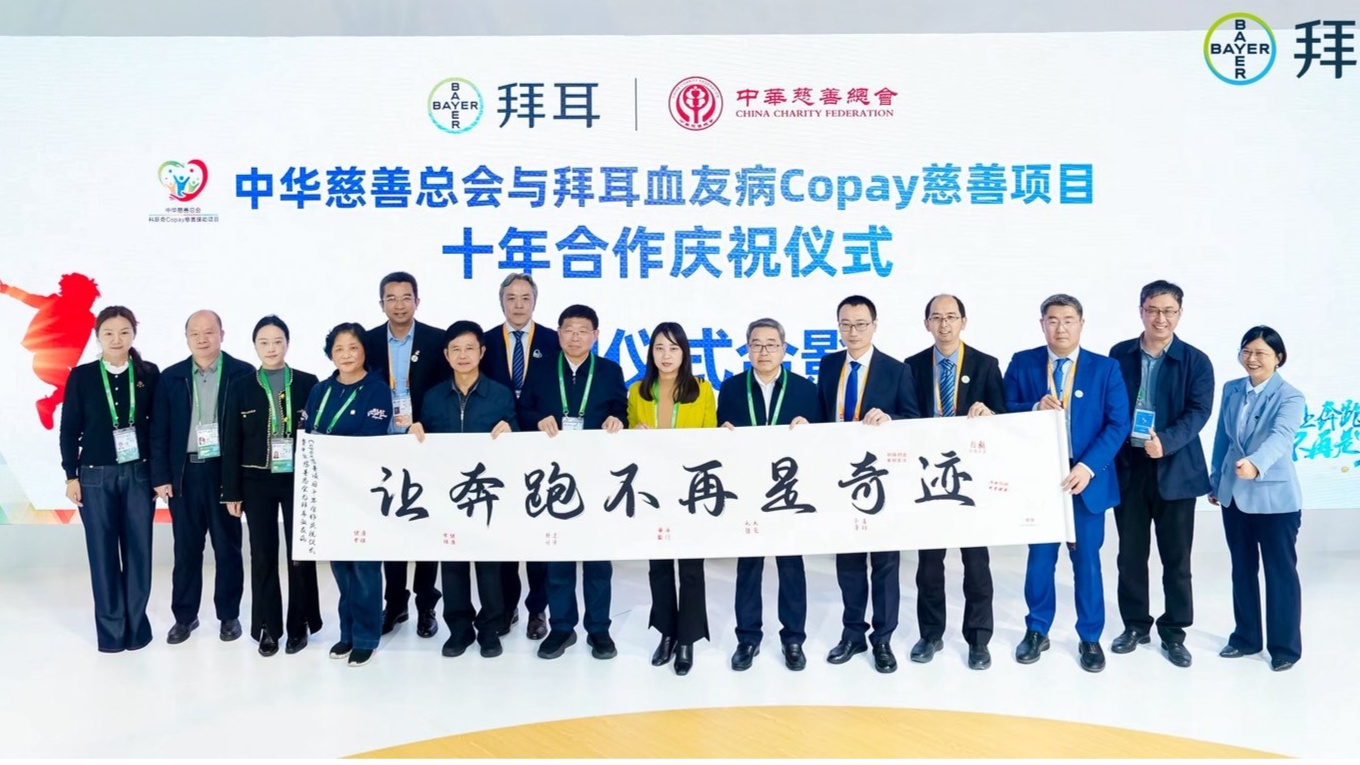 11月7日,在第八届中国国际进口博览会拜耳展台上举行了一场温馨而庄重的仪式——中华慈善总会与拜耳公司血友病COPAY慈善项目合作十周年庆祝活动。