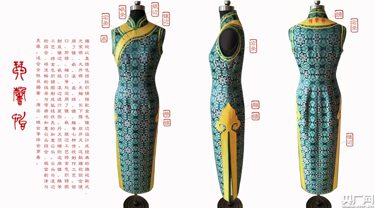海派时尚款是由上海市消保委通过上海新消费研究中心在线平台,选取各年龄段、不同行业的近2000名有代表性的消费者,从造型设计、图案纹样、色彩搭配、细节特色和购买意愿等五个方面,对16件商务款旗袍开展问卷评测。