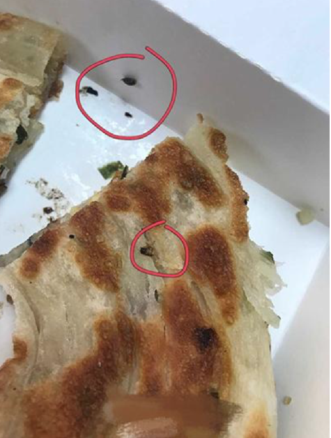 11月2日上午,臧小姐订了一份位于茅台路179号金虹桥国际中心千秋膳房的外卖。“这还是挺有名的一家连锁店。当天,我点了一份加蛋葱油饼配一份小米粥的套餐,共计18元。”臧小姐称,外卖送达后,她便像往常一样,打开盒子,大快朵颐地吃起来。葱油饼一切为四,叠加放置。在吃完放在盒子内上层的两块葱油饼后,臧小姐突然发现,下面两块葱油饼中间,似乎混入了一块黑色的“异物”。仔细一看,她立即干呕起来。“葱油饼内,竟然夹着一只蟑螂,还被拦腰切断,另外几截‘尸体’滚落在盒子底部。真是恶心到了极点!”