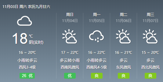 据预报,周日到下周中期,受西南暖湿气流加强影响,晴好天气将告一段落,本市的阴雨天气增多,气温变化平稳,预计在15~23℃。