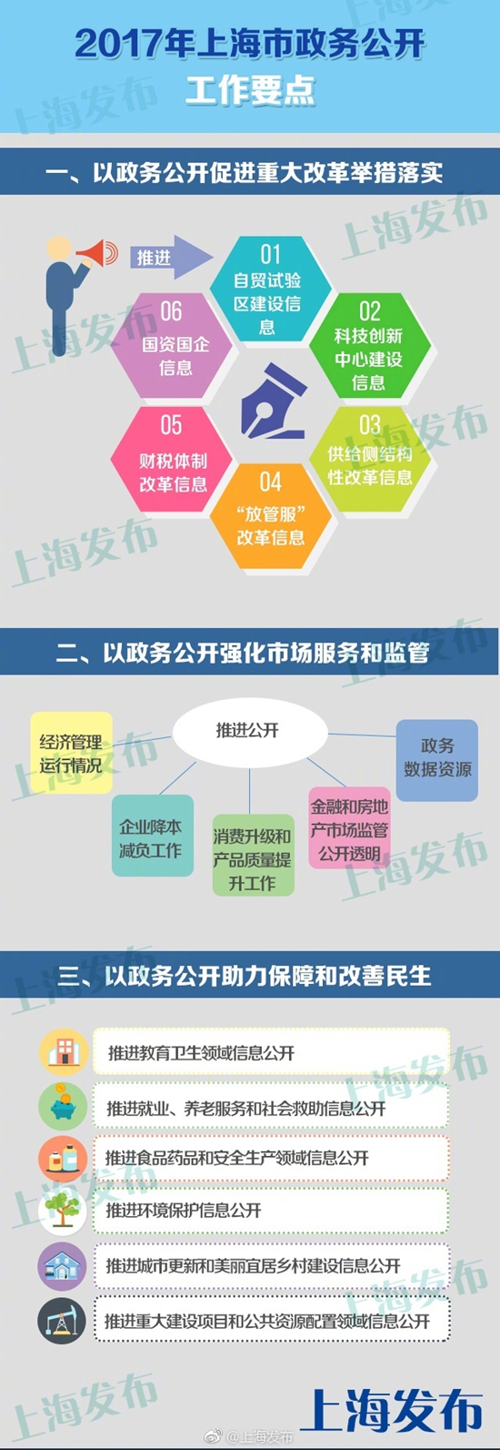 据上海发布,《2017年上海市政务公开工作要点》公布,将建立健全政务公开制度体系,全面推进决策、执行、管理、服务、结果公开,加强解读回应,扩大公众参与,不断增强政府公信力、执行力。以后,上海对教育卫生、就业、养老服务、食品药品和安全生产等领域的政府信息就能清楚啦。