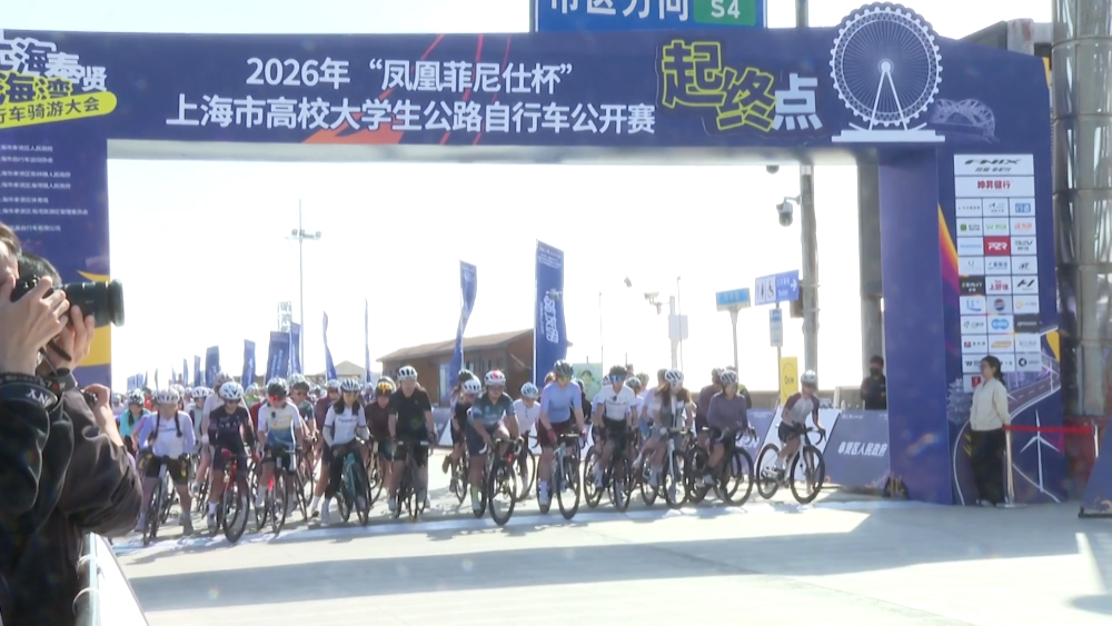 4月19日上午,2026“凤凰菲尼仕杯”上海市高校大学生公路自行车公开赛暨上海奉贤海湾自行车骑游大会在奉贤区海湾旅游区渔人码头正式开赛。