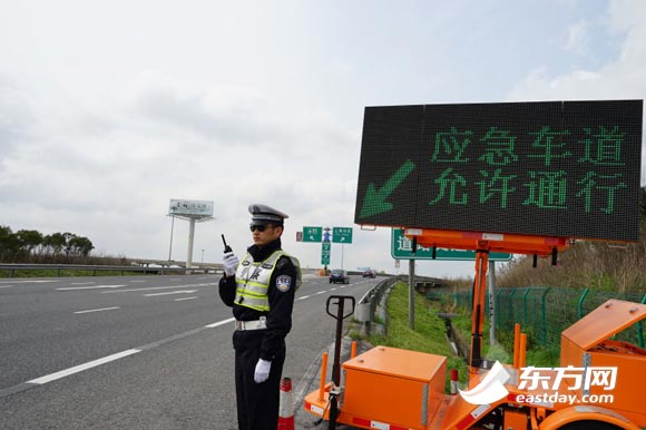 记者在距离长江隧道出口处看到,原先这里分隔成应急车道的白实线被重新漆划成了白虚线,应急车道也被改为普通车道。车道旁的空地上还放置着一块显示着“应急车道允许通行”的电子指示屏,提醒着过往车辆可以使用最右车道快速通过。据交警总队路设处副科长柴敬文介绍,由于节假日期间,从崇明长江隧桥通过高东收费站返回市区的车辆一直很多,交通压力较大,极易造成拥堵,例如去年清明小长假的最后一天,就有大量扫墓和踏青返程的车辆。现在将应急车道改为普通车道,等于原先的两根车道多增加了一根车道,再配合现场交警的指挥疏导,起到了一定的缓解车流压力的效果。早在今年春节的时候,该项措施就已经试用过一次,但因为春节假期比较长,车辆行驶路线比较分散,相对流量也没有那么高,所以试用的效果并不明显。