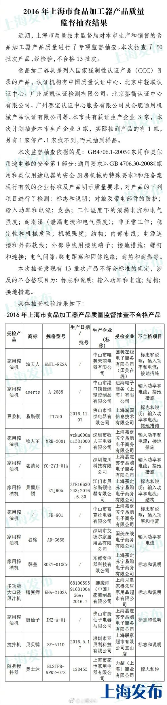 据上海发布,上海市质量技术监督局对本市生产和销售的50批次食品加工器进行监督抽查发现,膳魔师多功能大口径原汁机、油夫人家用榨油机、易斯顿豆浆机、贝贝鸭搅拌机等13批次食品加工器涉标志和说明、输入功率和电流、结构等不合格。