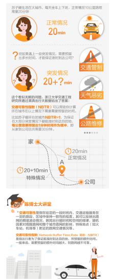 浙江大学交通工程研究所研究员陈喜群博士表示,城市道路系统经常受到随机因素的影响(交通事故、临时交通管制、突发自然灾害等),给居民出行带来极大的不确定性。同时随机因素降低了交通运行的可靠性,对城市交通功能的发挥和城市发展产生了不利的影响。简单地说,交通可靠性可以反映出路网的拥堵波动情况,居民出行随时间和空间的规律,随机因素对周围路网和整个城市路网的影响,特殊地点(如火车站,机场等)附近的路网交通情况等。