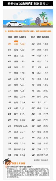 为何哈尔滨和长春这两座东北重镇会名列前茅?对此,陈喜群博士认为,在测算的2015-2016年期间,这两座城市正在发展地下轨道交通,道路施工较多,造成地面道路的通行能力下降;同时两座城市均为北方城市,冬季下雪天气较多,使得路面结冰,降低道路通行能力,且易发生交通事故,这也造成了交通可靠性的降低。