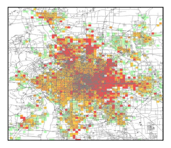 (图中红色越深表示交通可靠性程度越低, 可靠性较低的区域主要集中在繁华商业区和交通枢纽及换乘地区,如王府井、五道口、四元桥、远通桥等)