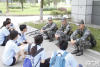 炎炎夏日,两名军人还全副武装为同学们展示了负重装备,热得汗流浃背。有同学亲身感受了负重装备,只觉得寸步难行,可以想象背着负重装备越野是多么地不易。 -