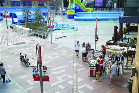周一晚上,记者来到位于共和新路共康路路口的绿地新都会,不同于数年前灯火通明、人头攒动的热闹景象,原本露天广场上一个挨着一个的小商品摊位被偌大的充气水上乐园所替代。晚八九点的光景,整个广场几乎是黑洞洞一片,偶尔有家长带着刚上完早教、培训课程的孩子从一旁的商场中走出,也是步履匆匆。据保安透露,广场夜市已于今年7月1日终止,改为商场推出的其他游艺项目,而有关夜市取缔的原因以及日后的规划方向等,截至记者发稿前,绿地新都会方面暂未作明确回应。