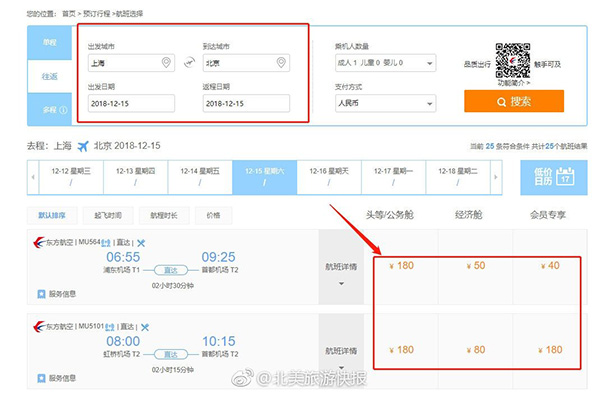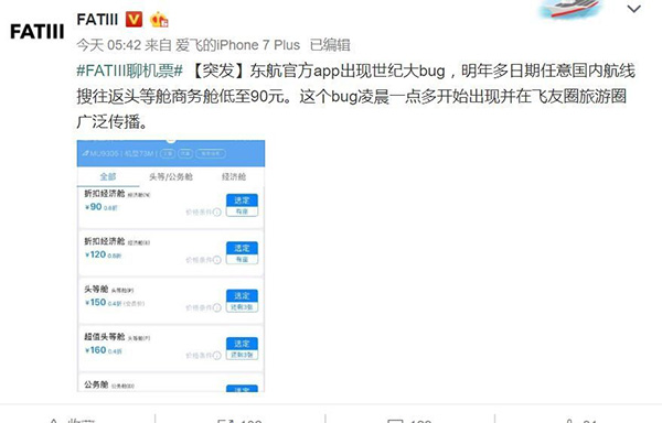 11月17日凌晨,有网友发文称,东航官方App突然出现bug,多条国内航线头等舱商务舱往返机票,最低只需90元。不少网友在微博上晒出自己低价买到的机票截图,甚至东航官网上显示的机票信息,票价同样几十几百元不等。
