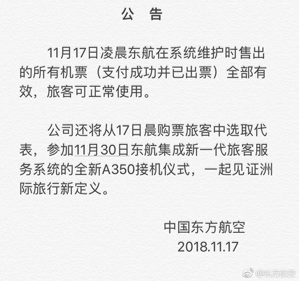 东航“霸气”地回应了。17日11时54分,东方航空官方微博@东方航空发布公告:11月17日凌晨东航在系统维护时售出的所有机票(支付成功并已出票)全部有效,旅客可正常使用。