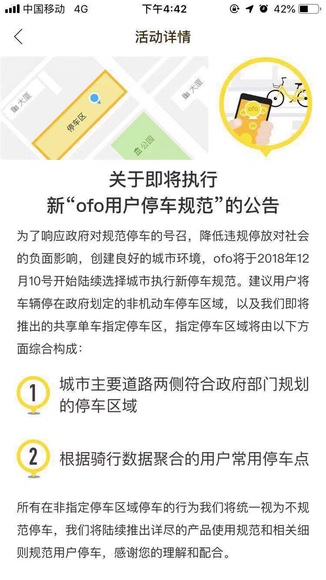 ofo相关负责人表示,与此前ofo在广州、深圳等部分城市推出的禁停区相比,此次改革侧重于引导用户在指定地点停车,可以说是用户停车规范的全新“升级版”。