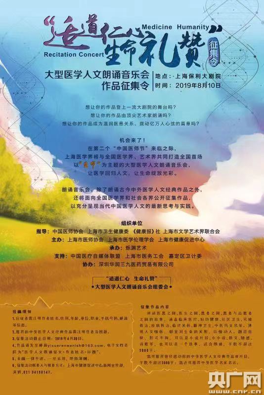 央广网上海2月27日消息(记者杨静 通讯员宋琼芳)继《人间世》《急诊室故事》等具有全国影响力的爆款作品之后,上海又推出全国首场以“生命”为主题的大型医学人文朗诵音乐会将在第二届“中国医师节”。