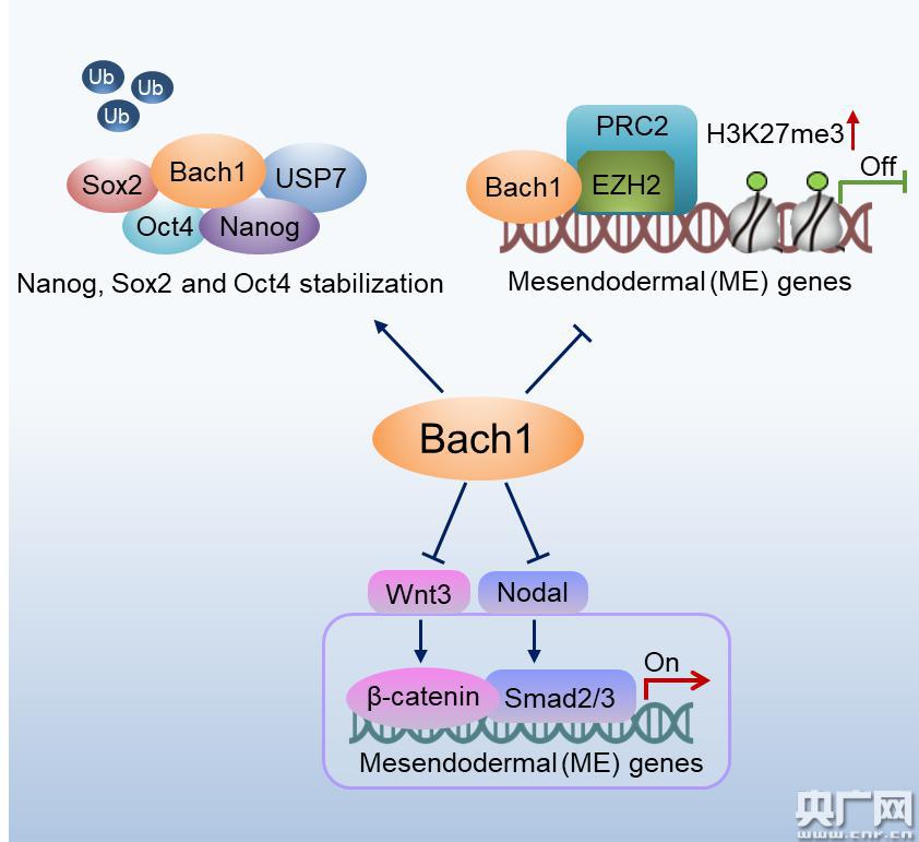 Bach1维持人胚胎干细胞自我更新并抑制干细胞向中胚层和内胚层分化的机制图(央广网发 图:尹逸柔)