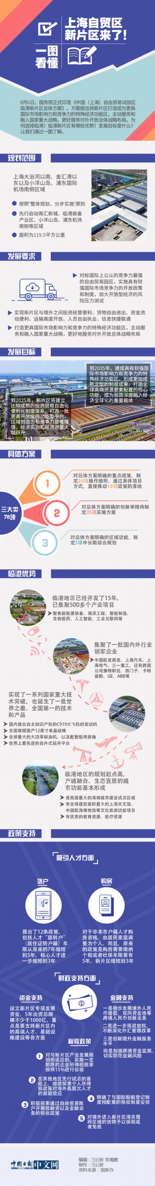 8月6日,国务院正式印发《中国(上海)自由贸易试验区临港新片区总体方案》。方案提出将新片区打造成为更具国际市场影响力和竞争力的特殊经济功能区,主动服务和融入国家重大战略,更好服务对外开放总体战略布局。