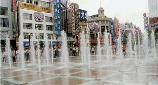 金带:南京路不再有“上街沿”,路幅宽20—28米的整条步行街以4.2米宽的“金带”为主线。金带以意大利进口的印度红花岗岩铺成,并不位于路的正中而是略为偏北,这样行人能行走在步行街的中央,且有一个更好的视野环视四周。