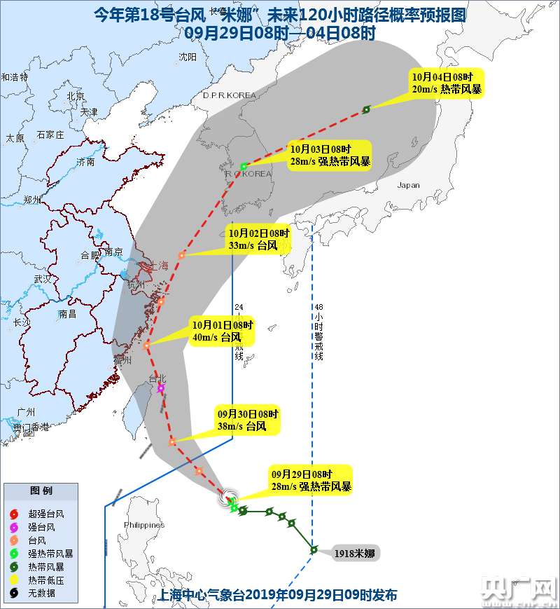 上海中心气象台今天09时发布台风“米娜”预计路径图(央广网发 上海中心气象台供图)