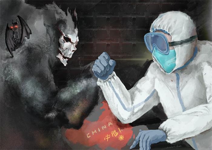 这张作品内,背景是幽暗的铁笼,除恶魔形象的病毒外,还塑造了一个坚定的医务人员的形象。他在尽全力抵抗病毒对这个国家的吞噬,他只是千千万万个奋战在战“疫”一线的医务人员的缩影,他们给这铁笼带来了光和希望。