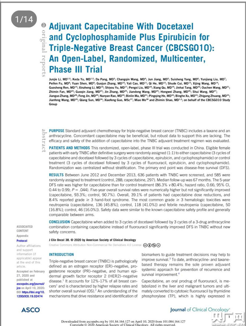 如今,这项联合卡培他滨辅助化疗的三阴性乳腺癌治疗“中国方案”是中国乳腺癌辅助治疗研究领域首个刊登在《JCO》具有中国自主知识产权的临床研究,它将在保障患者安全性、耐受性的同时,显著提高三阴性乳腺癌患者预后,未来有望写入治疗指南,成为全球三阴性乳腺癌治疗的标准方案。