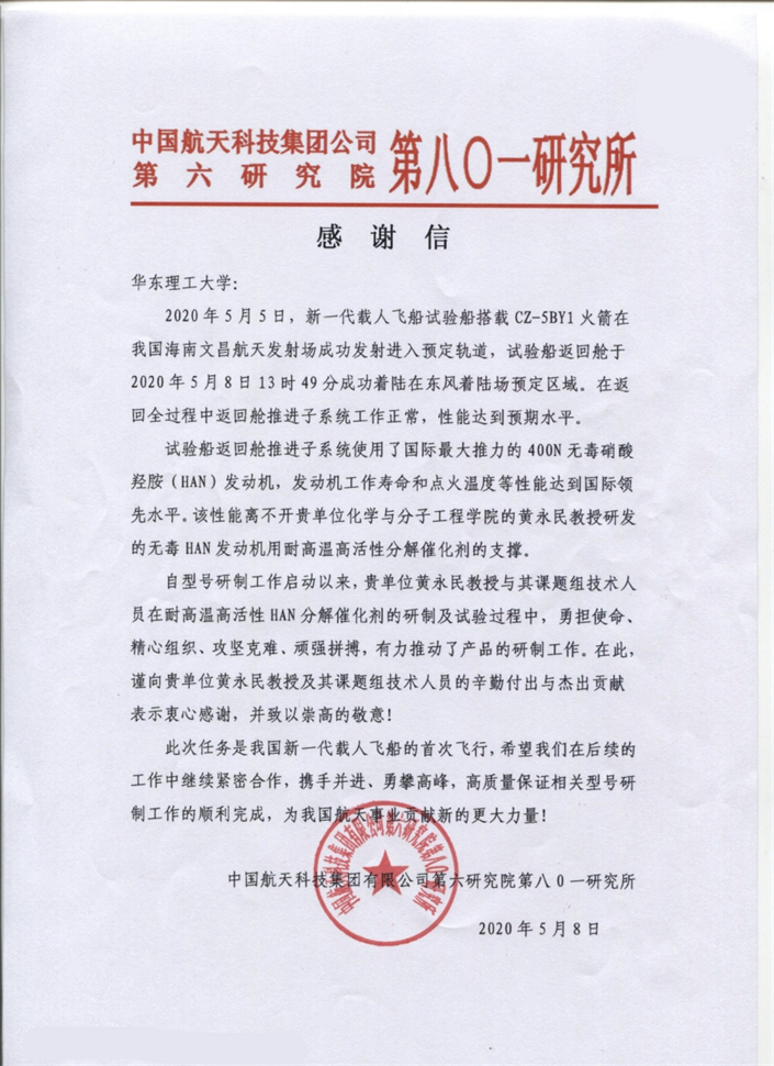 据了解,此次我国新一代载人飞船试验船姿控动力系统上配备的是国际上推力最大的HAN无毒单元发动机,这对催化剂的活性及高温稳定性提出了更为严苛的要求。作为大推力单元无毒发动机的关键功能材料,华东理工大学黄永民教授研制的HAN分解催化剂在此次空间飞行任务中表现完美,为新一代载人飞船试验船的安全返回、精准着陆提供了可靠保障。日前,中国航天科技六院801所向华东理工大学发来感谢信,致谢黄永民教授为型号研制所作的杰出贡献。