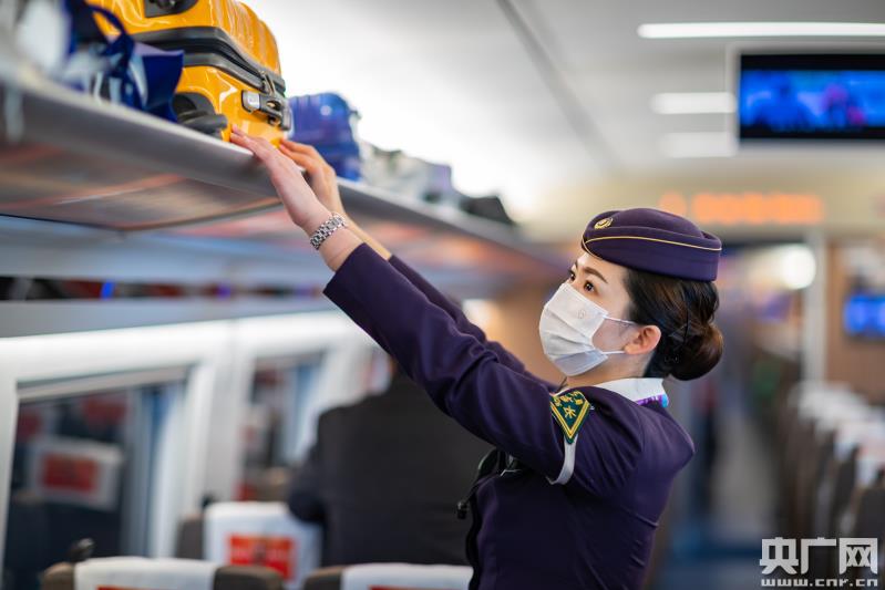 上海客运段值乘的G22次列车上,乘务人员在整理行李架上的物品。 (央广网发 李忱摄)