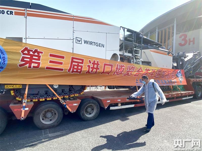前期分拆运入现场的首件展品维特根道路就地冷再生设备(央广网记者 唐奇云 摄)