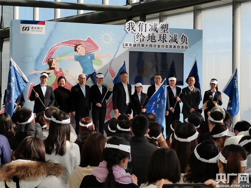 在本次活动的主会场朵云书院上海中心旗舰店,浦发银行志愿者代表们宣读“减塑”倡议书,来自上海市发改委、生态环境局、国资委、世纪出版集团以及浦发银行的领导为志愿者授旗。