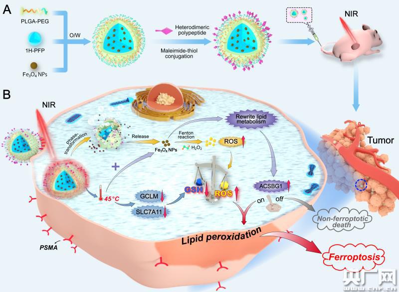 纳米材料合成及热触发肿瘤代谢重编程诱导铁死亡的示意图(央广网发 仁济医院供图)