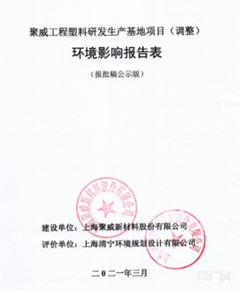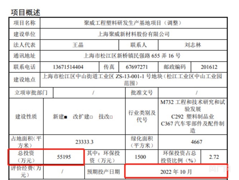 但公开资料显示,2021年3月,聚威新材对研发生产基地项目进行环保公示,上海聚威新材料股份有限公司在上海市松江区中山街道工业区ZS-13-001-1号地块建设生产厂房,用作集团总部、研发中心、生产车间、测试中心、内部行政办公及生活服务设施用房,总用地面积23333.3平方米。该项目根据市场需求和公司生产管理要求变化,设计产能有所调整,调整后改性工程塑料年产量为16000吨/年,增加4000吨/年;汽车零部件年产量为150万件/年,减少150.01万件/年;研发量为150万件/年,减少250万件/年。该项目总投资55195万元,计划2022年10月投产。