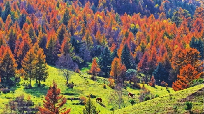 秋色正浓的山西省太原市娄烦县云顶山,层林尽染,五彩斑斓,美景如画。