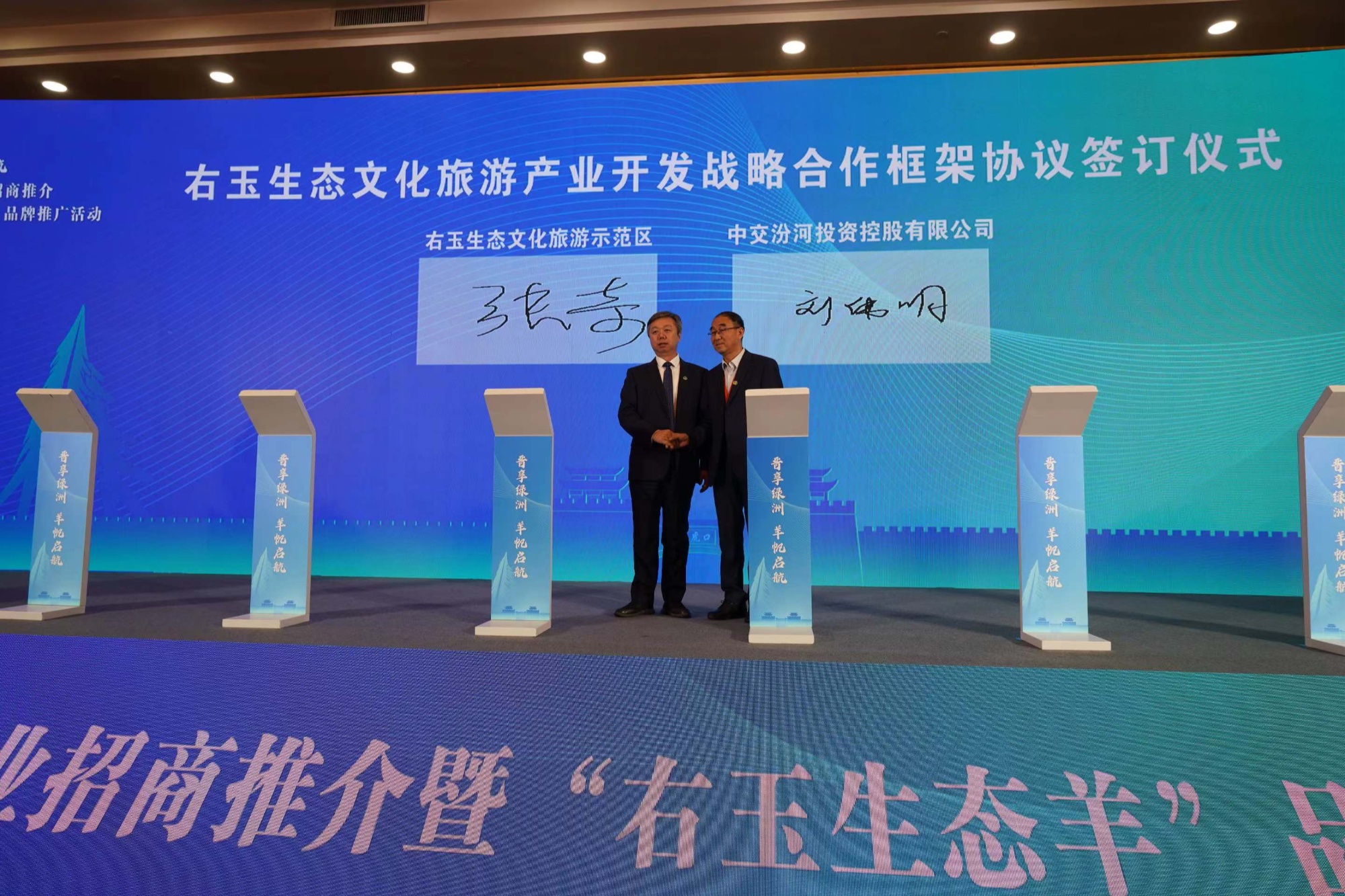 活动现场还举行了签约仪式和“右玉生态羊”行业协会会员单位授牌仪式。左丽峰、吴瑞军、马占文分别向山西祥和岭上农牧开发有限公司、山西玉羊肉业股份有限公司、右玉县大西口农牧有限公司授牌;中交汾河投资控股有限公司总经理刘伟明与张奇签订了生态文化旅游产业开发战略合作框架协议。同时,万家寨水控集团党委委员、副总经理曹池,江苏为恒智能科技有限公司项目经理刘卫林,北京云行雨步商业管理公司副总经理孙铎,山西农到家食品有限公司负责人储天成,右玉县桃花源生态产业园有限公司负责人曹振国分别与刘继珍签约了苍头河流域右玉县段生态修复及文旅开发项目、300MW/600MWh储能电站建设项目、右玉县中陵湖郊野公园建设项目、红旗口林下露营基地项目和右玉县桃花源生态休闲产业园开发项目等5个项目,签约总额21.279亿元。