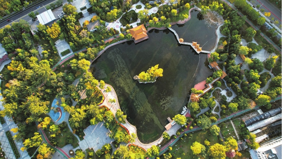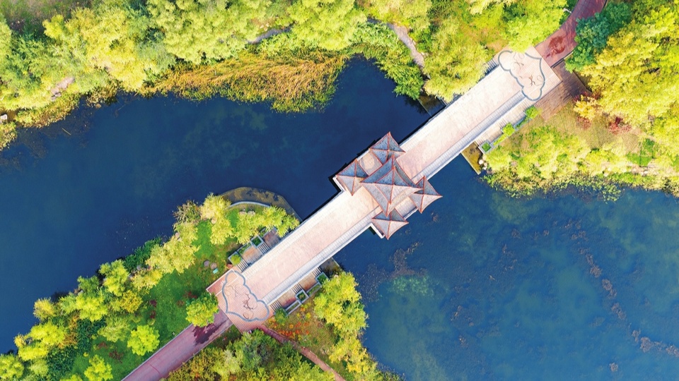 阳泉市中心公园叠翠流金、湖桥映景,彰显“煤铁之乡”生态优先的宜居底色。