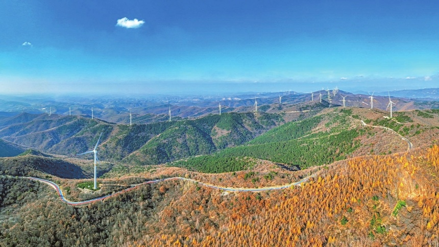 连绵的群山披上斑斓色彩,成片的风电设施在山间匀速转动。