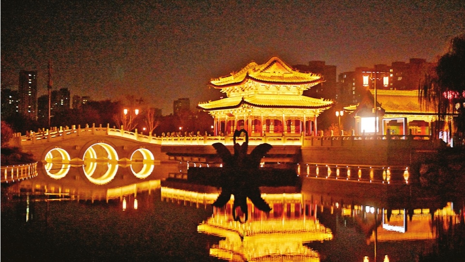 太原市双塔公园内灯光璀璨,暖黄光影勾勒出的精致亭台、小桥,与湖光树影相映成趣。