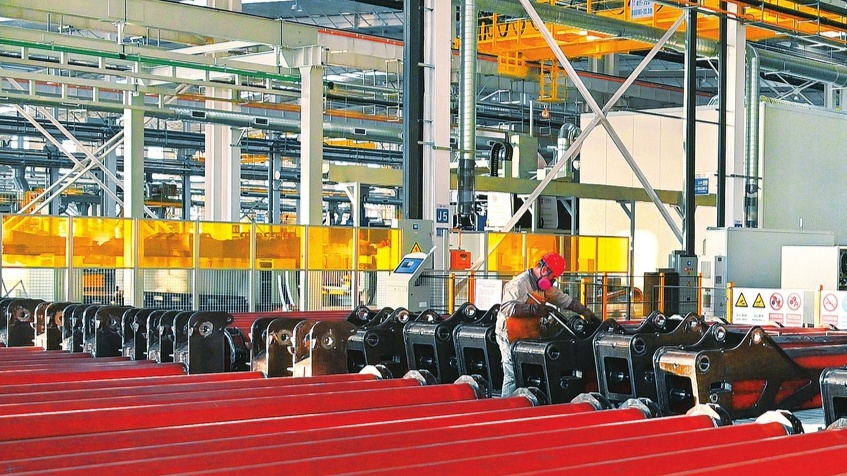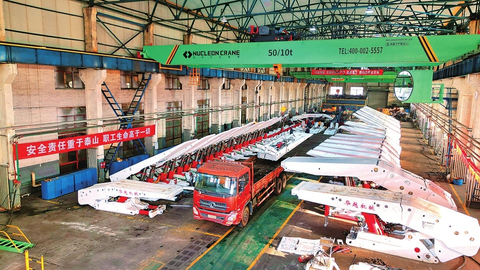 太重工程起重机公司生产车间内,质检人员正对随车吊伸缩臂开展焊缝检测。
