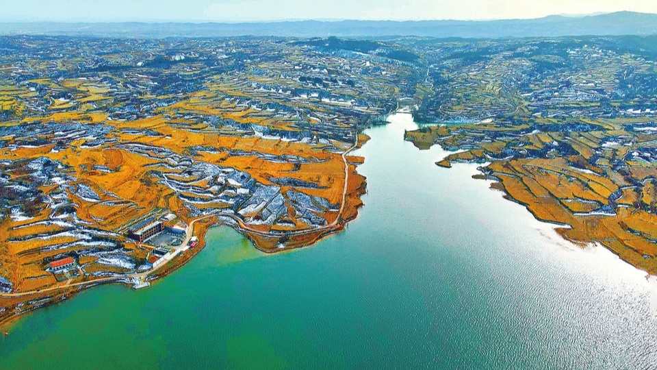 水面波光粼粼,与蓝天、黄土相映,绘就冬日生态画卷。