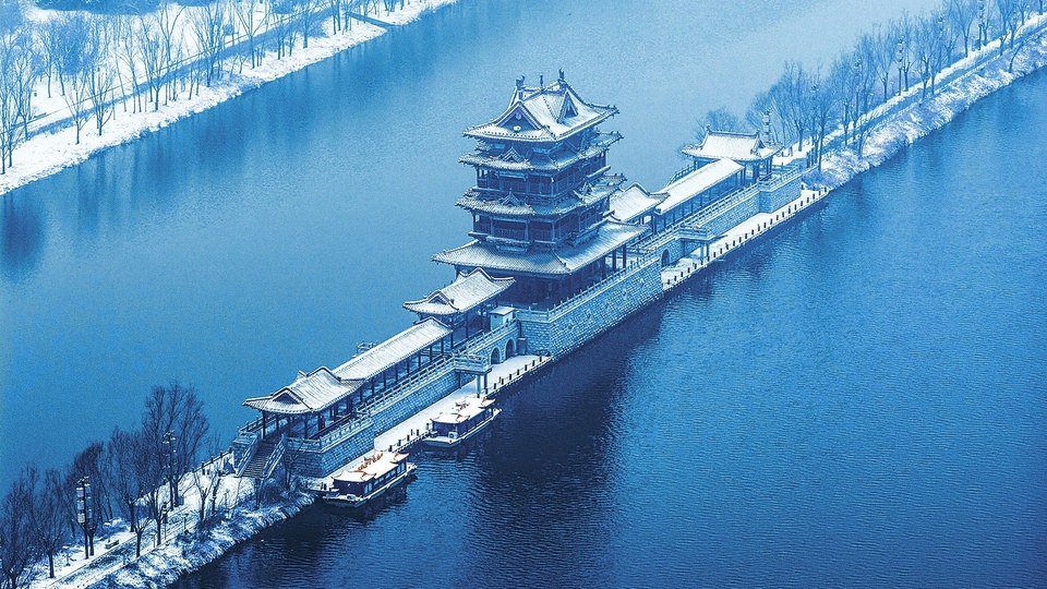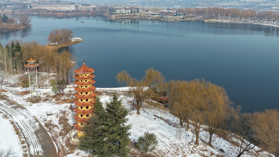 七一水库在白雪的映衬下呈现出一幅静谧迷人的冬日画卷。
