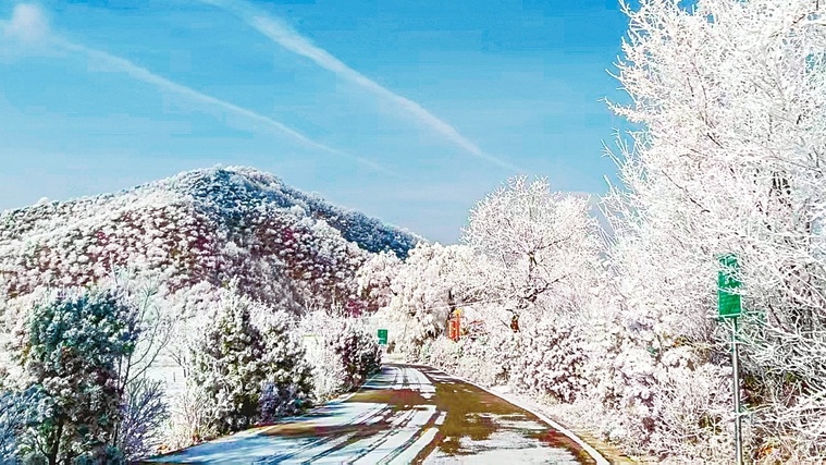 太行一号旅游公路两侧现雾凇冰挂的绝佳美景,山林间玉树琼枝、冰清玉洁,美不胜收。