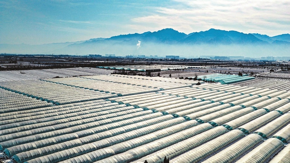 农场里,温室大棚整齐排列,与远山相映成趣。