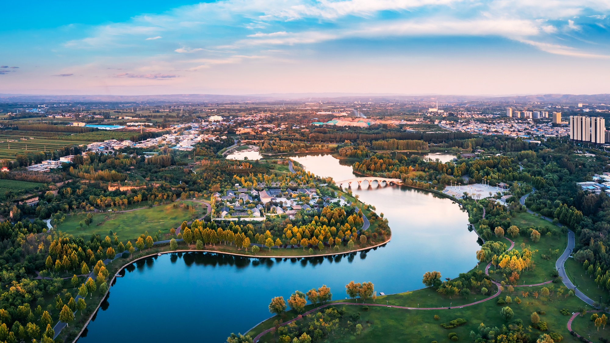 从空中俯瞰永济市城区,宛如仙境,美不胜收。