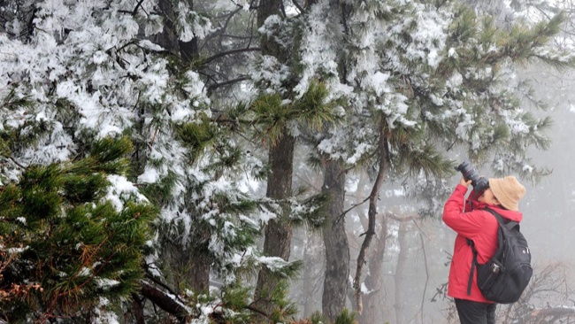 山间银装素裹,松枝凝霜挂雪,冰清玉洁,与初春景致相映,宛若仙境。