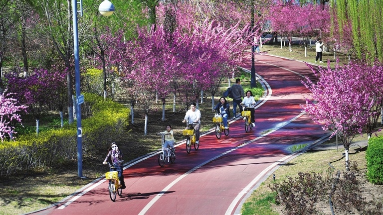 不少市民骑行健身,在碧水蓝天间乐享春光。