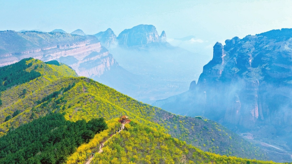 漫山连翘花次第绽放,缀满太行山峦。