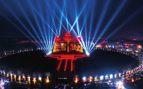 2月11日,“华人老家,幸福临汾”主题光影秀将夜晚的临汾装点得流光溢彩、如梦如幻。(闫锐鹏摄)