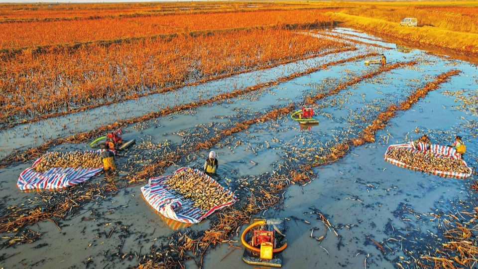 种植户们趁晴好天气抓紧采收,将新鲜莲藕及时发往陕西、四川、重庆等地销售。