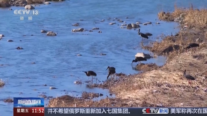 山西阳泉:黑鹳组团飞抵湿地 部分停留越冬