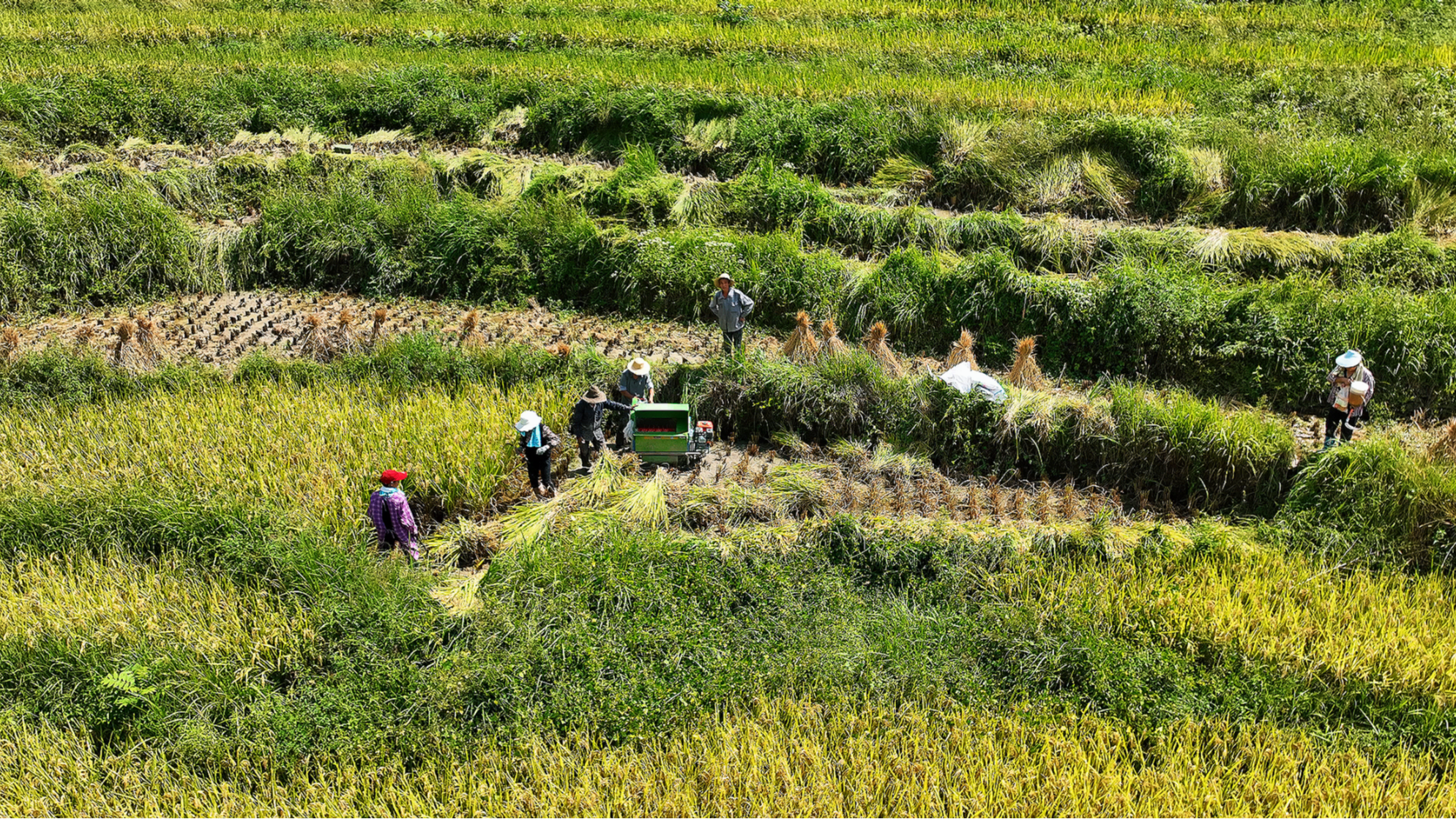 层层叠叠的梯田上,稻穗低垂、金黄遍野,农户们穿梭其间,小型农机的轰鸣声与欢笑声交织,描绘出一幅忙碌而喜悦的丰收画卷。