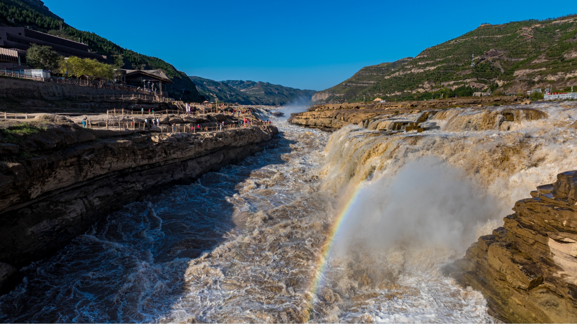 近日,黄河壶口瀑布景区出现壮丽彩虹景观,吸引众多游客驻足观赏、拍照留念。
