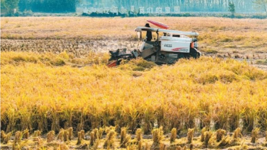金秋时节,长安区十里蛤蟆滩稻浪翻金,收割机在田间穿梭,裹挟着稻香的风里,连片“桂花球”水稻正迎来抢收。