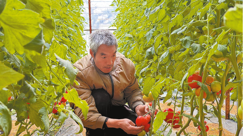 2月1日,在大荔县冯村镇新庄村的设施大棚里,翠绿的藤蔓之间,红彤彤的西红柿缀满枝头,个个饱满鲜亮。